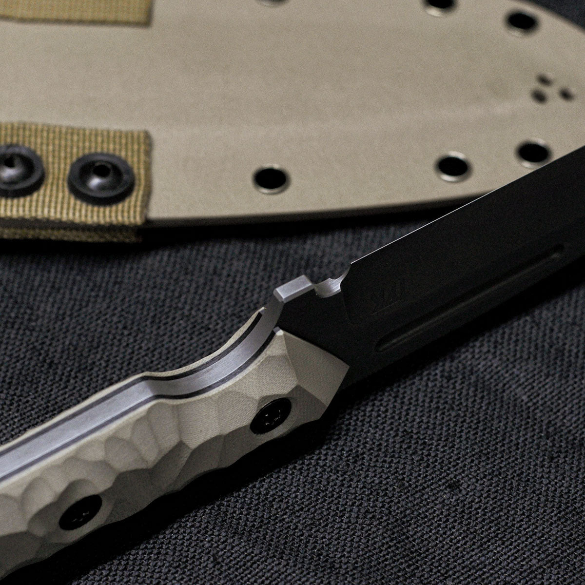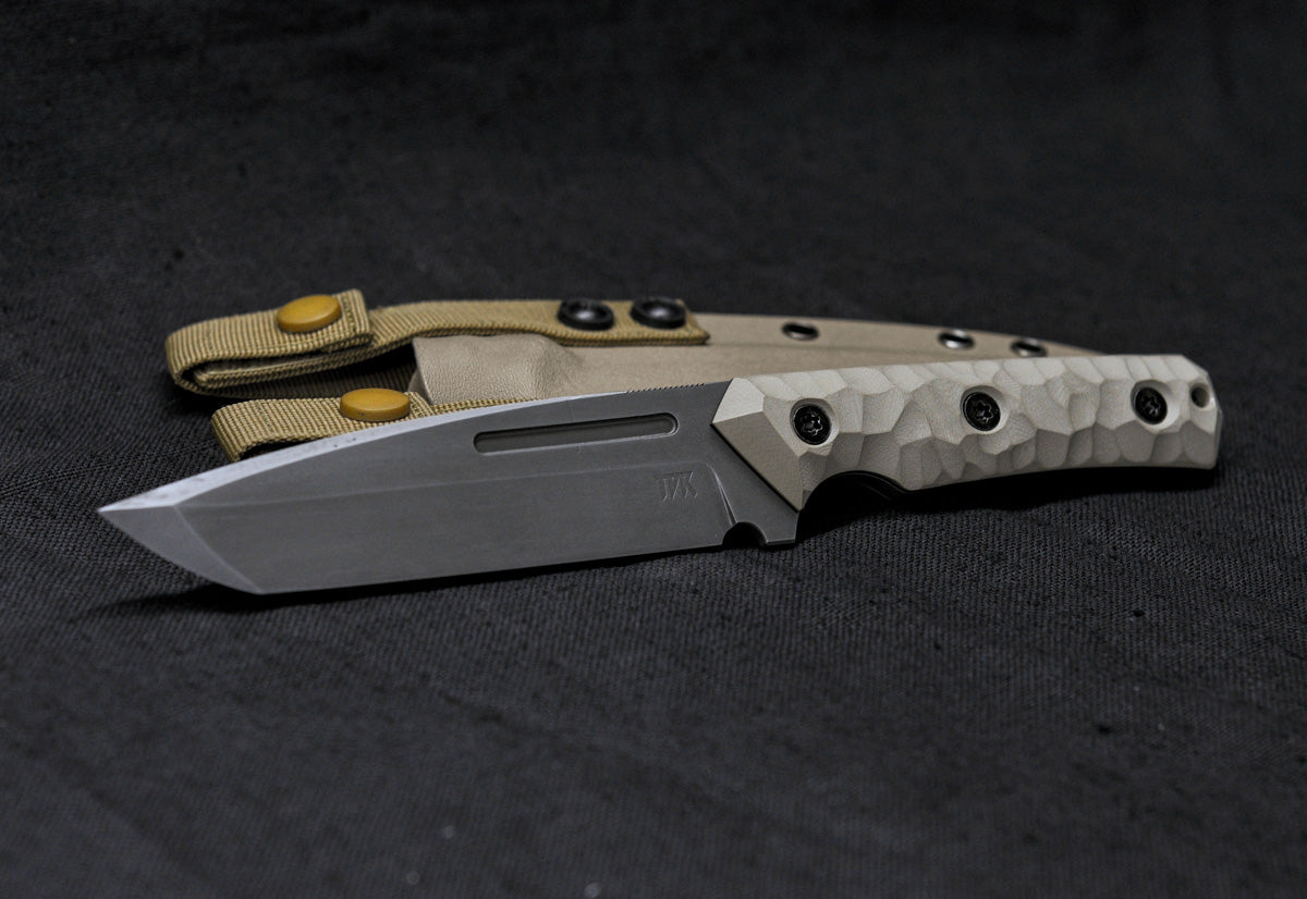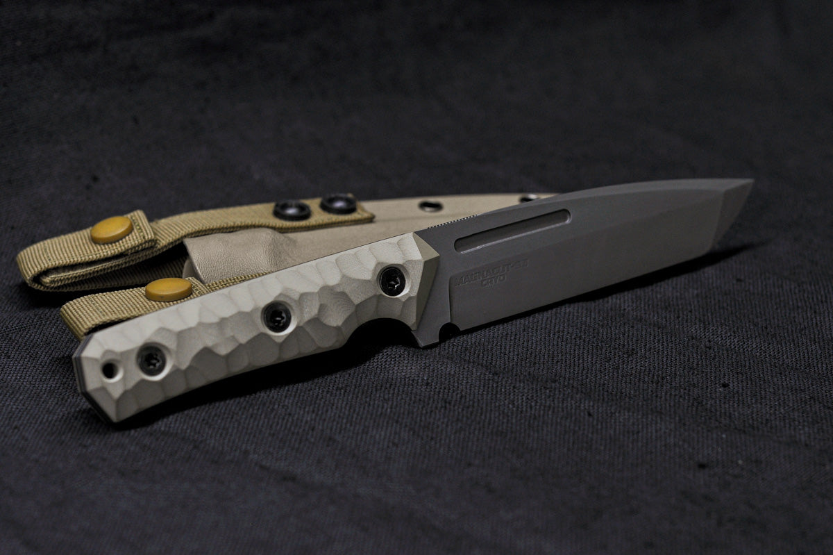 Aggressive tanto-droppoint blade in a medium size suitable for heavy tasks.